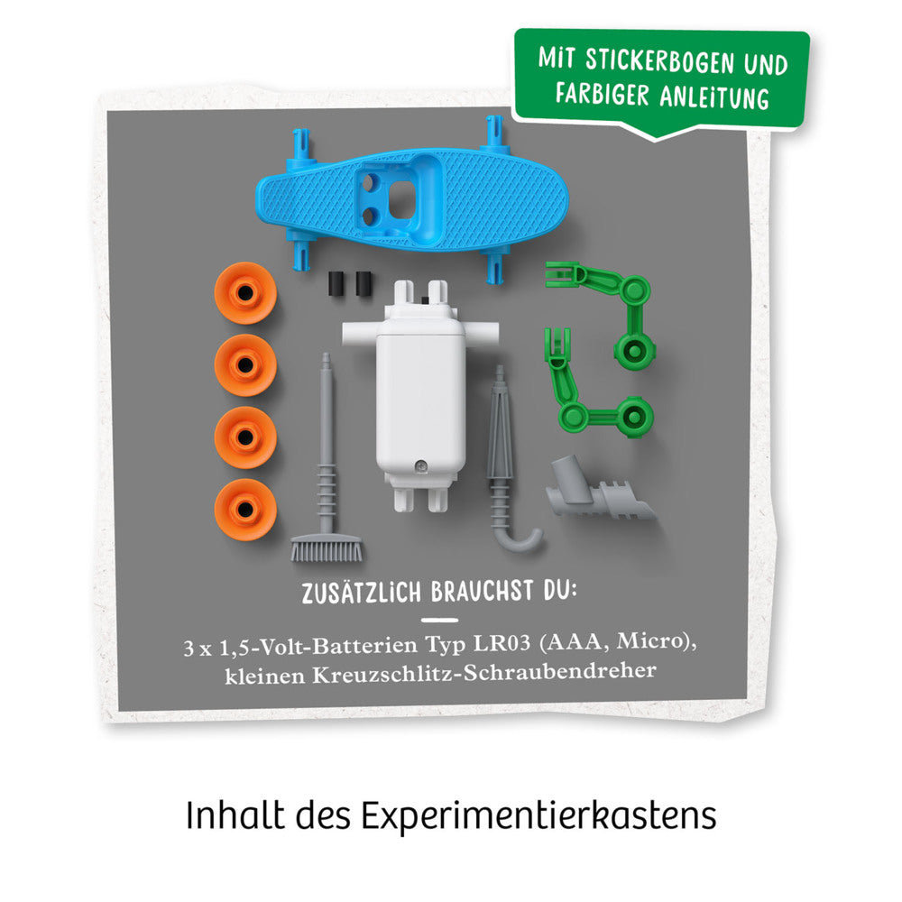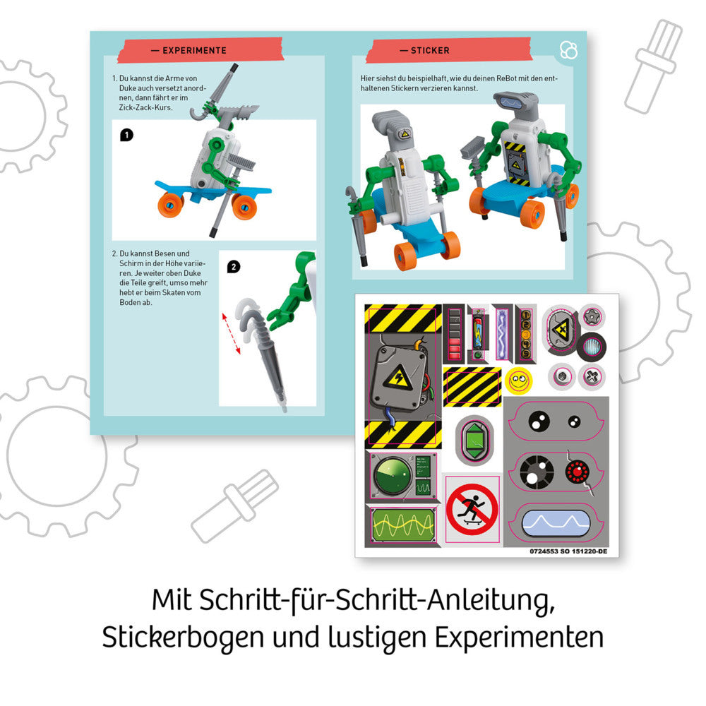 Experimentierkasten mit Bauteilen zum Zusammenbau des Rebotz-Roboters „Duke“, Motor, Zahnrädern, Rädern und bebilderter Anleitung |