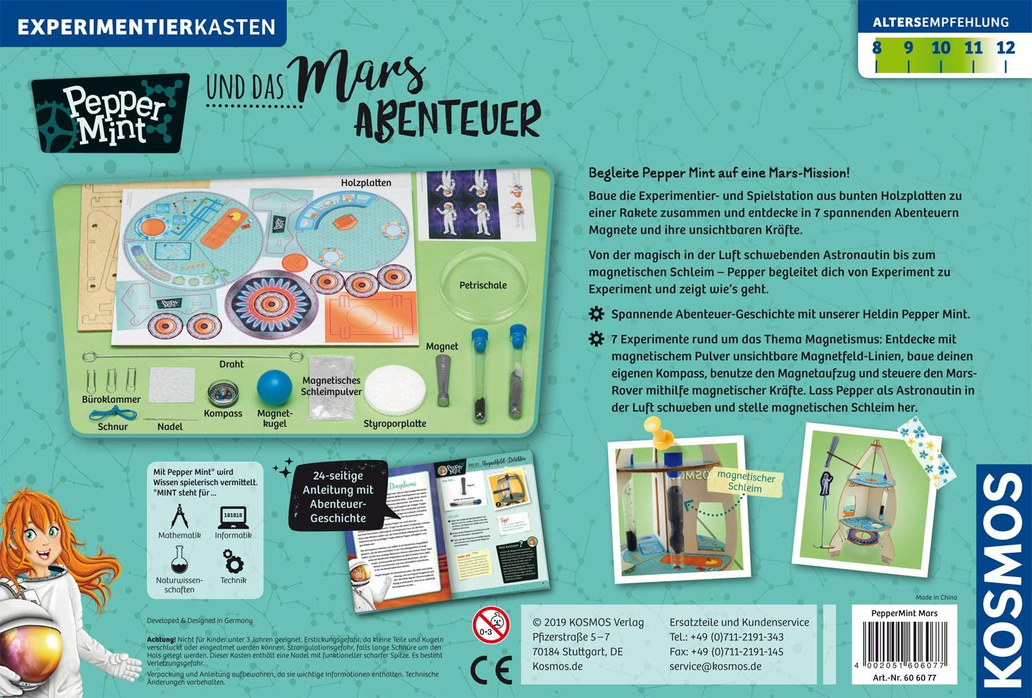 Welche unsichtbaren Kräfte stecken in Magneten? Mit dem Experimentierkasten Pepper Mint und das Mars-Abenteuer von KOSMOS werden 8 bis 11-jährige zu Weltraumforschern. Im Handumdrehen wird dafür eine Rakete aus hochwertigen Holzplatten zusammengebaut. Sie ist die Experimentier- und Spielstation für sieben spannende Versuche.