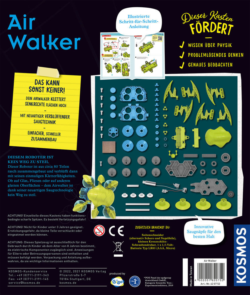 Mit dem KOSMOS Air Walker bauen Kinder ihren eigenen Kletterroboter, der sich dank Luftdruck und cleverer Technik sogar an glatten Scheiben bewegt! Dabei lernen sie spielerisch die Grundlagen von Mechanik, Physik und Pneumatik. Ein faszinierendes MINT-Erlebnis für junge Technikfans. |