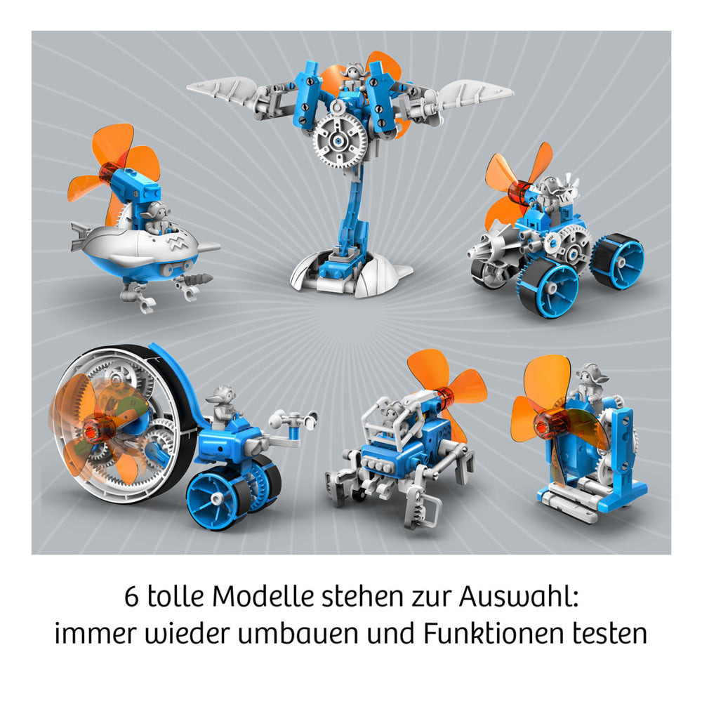 Allein der Wind treibt sie an! Egal ob Flugmaschine, Tricycle oder Surf Bot - diese insgesamt 6 Roboter-Modelle warten nur auf den nächsten Windstoß, der sie in Gang setzt. nAus über 100 Einzelteilen werden die Wind Bots aufgebaut und immer wieder umgebaut. Unendlicher Spaß für alle Konstruktions-Fans! nAber auch an windstillen Tagen gibt es für die Bots kein Halten. Mit der praktischen, handbetriebenen Windmaschine fahren, laufen und krabbeln sie auch in Innenräumen munter drauflos. nNebenbei erklärt die bebilderte Schritt-für-Schritt-Anleitung, wie emissionsfreie Antriebe funktionieren und wo Windantrieb im Alltag bereits genutzt wird. nDieser KOSMOS Experimentierkasten für Kinder von 8 bis 12 Jahren macht das Element Luft zum Highlight. nnJetzt wird's windig! Denn die 6 verschiedenen Modelle werden allein durch Wind angetrieben und sausen durch das Kinderzimmer. Selbst an windstillen Tagen ist das kein Problem - da kommt einfach die praktische handbetriebene Windmaschine zum Einsatz. Egal wie die Wind-Bots fahren, laufen oder krabbeln, alle werden aus den über 100 Einzelteilen zusammengesetzt und können immer wieder aufs Neue umgebaut werden. Ob Flugmaschine, Quad-Läufer, Bohrer-Truck oder einer der anderen Roboter, die Kinder lernen mit ihnen Wind als ein Beispiel für erneuerbare Energien kennen - denn die Bots funktionieren natürlich ganz ohne Batterien. Ein Konstruktions-Spaß von KOSMOS für Kinder zwischen 8 und 12 Jahren, die nur darauf warten, endlich eine Menge Wind abzubekommen!