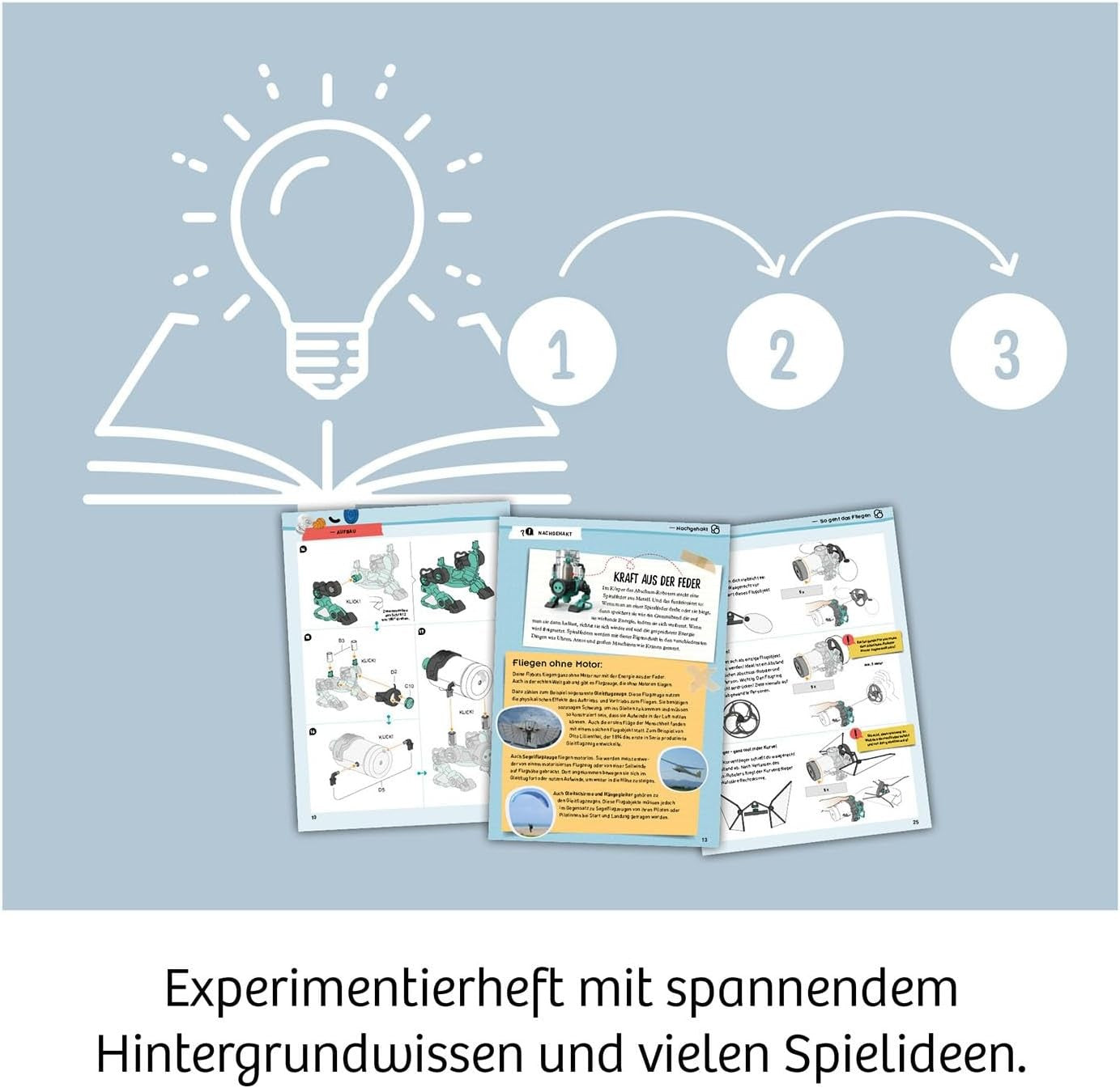 - Das Experimentierheft führt nicht nur durch den Aufbau des Sets und hält spannende Infos zu den Themen Fliegen und Federn parat, sondern beinhaltet auch viele Flybot-Spielideen.