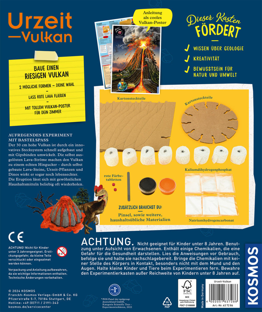 Mit dem KOSMOS Urzeit-Vulkan Experimentierkasten erleben Kinder ab 8 Jahren die Faszination der Natur hautnah! Aus Gips bauen und bemalen sie ihren eigenen Vulkan, bevor sie den spektakulären Vulkanausbruch mit einer sicheren chemischen Reaktion auslösen. Dabei lernen sie spielerisch, wie echte Vulkane funktionieren – von der Magmakammer bis zur Lavafontäne. Ideal für kleine Forscherinnen und Forscher, die sich für Geologie, Chemie und Naturphänomene begeistern. |