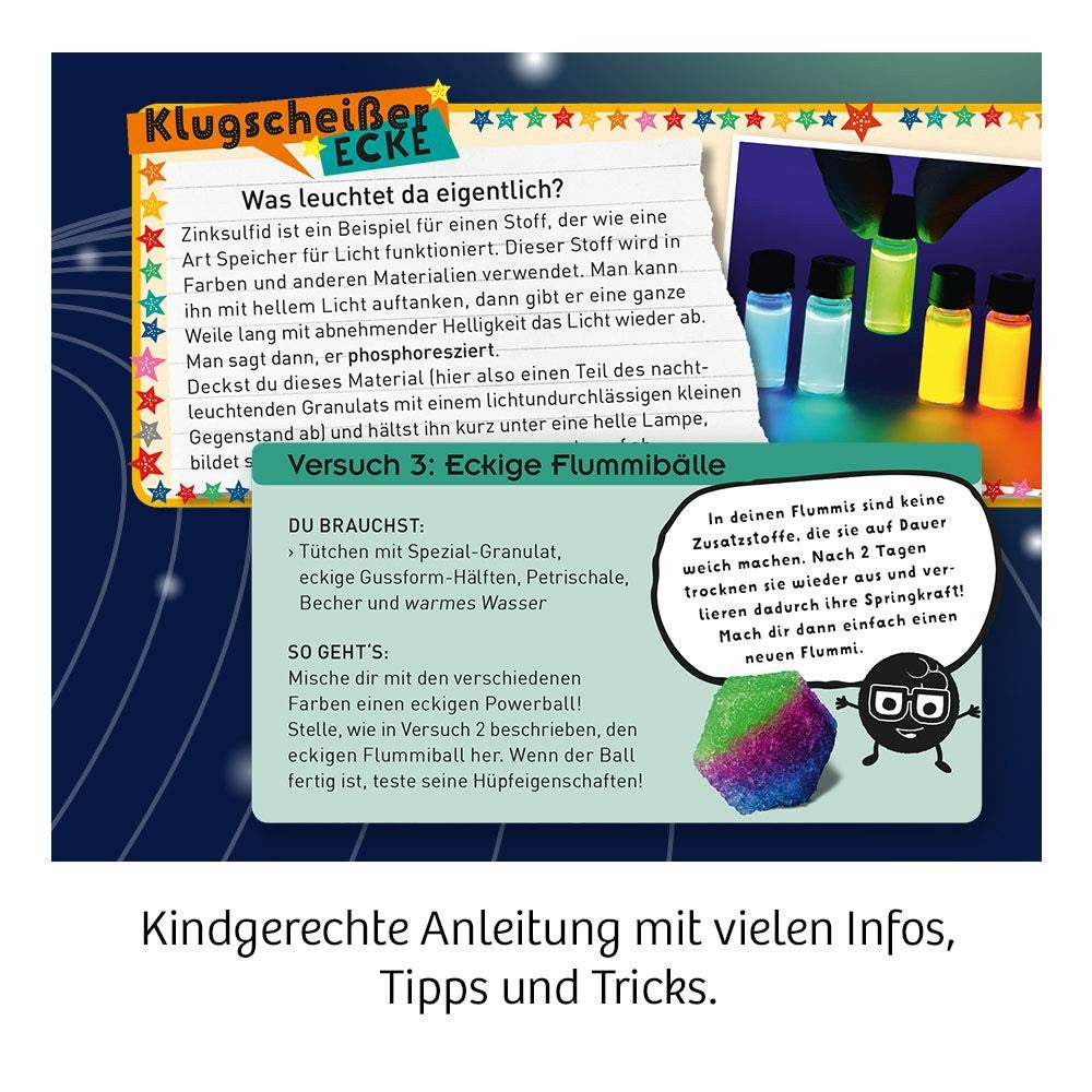 Inhalt: Nachtleuchtendes Spezialgranulat und weitere Farben, Gussformen für coole Bälle, Deko-Augen und Versuchsbecher