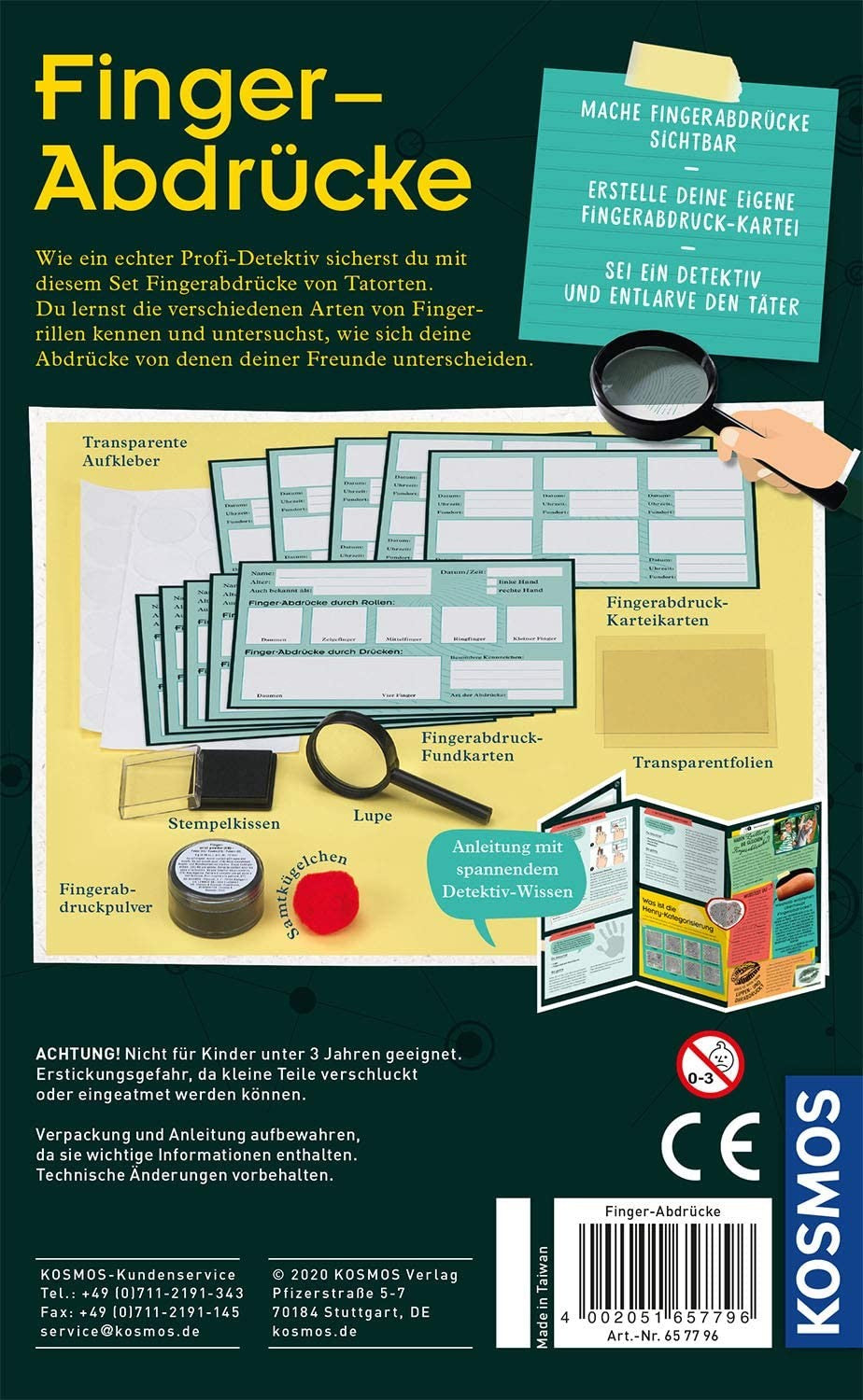 - Ob als Geschenk oder als Teil einer coolen Kindergeburtstags-Party, das Experimentierset Fingerabdrücke bietet kriminologischen Spaß für Kinder ab 8 Jahren.
