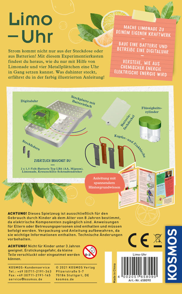 Kosmos, Limo-Uhr, Strom erzeugen, Experimentierkasten, Elektrizität, Batterie, DIY, Kosmos Experimente, MINT, Forschen, Physik, Energie, Experiment, Lernspiel, Geschenkidee, Mitbringsel, Kindergeburtstag, Kosmos Forscherset |