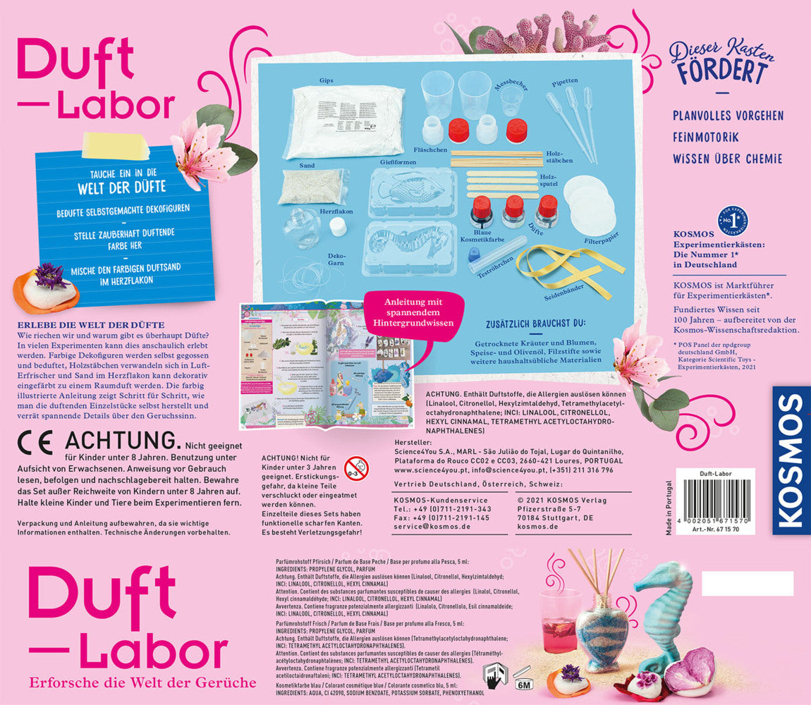 Mit dem Duft-Labor von KOSMOS entdecken Kinder die spannende Welt der Gerüche und Parfüms! Sie können ätherische Öle mischen, Duftproben testen und eigene Parfüms kreieren. Ideal, um spielerisch zu lernen, wie Geruchssinn und Chemie zusammenwirken. Perfekt für kleine Forscherinnen und Forscher ab 8 Jahren. |