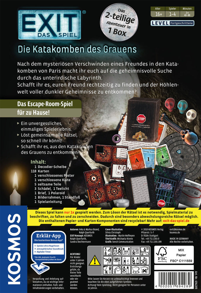 Aus der erfolgreichen Spielereihe "EXIT® - Das Spiel". nEin Escape-Room-Spiel für zu Hause. nDas zweiteilige Abenteuer in einer Box. n1-4 SpielerInnen lösen im Team clevere Rätsel und brauchen dazu Teamgeist, Kreativität und Kombinationsgeschick. nKooperatives Erlebnisspiel im Level: Fortgeschrittene. nMit Tutorial in der kostenlosen KOSMOS-Erklär-App. nMit und ohne App spielbar. nIdeal als Partyspiel, Eventspiel und als Geburtstagsgeschenk. nDa die Materialien für die außergewöhnlichen Rätsel verändert werden, nur einmal spielbar! nnDüstere Gewölbe unter der Stadt der Lichter. Die Katakomben von Paris verschlucken das Licht, Geheimnisse und scheinbar auch Personen. Nach dem mysteriösen Verschwinden eines Freundes in den Katakomben, machen sich die Spieler auf die geheimnisvolle Suche durch das unterirdische Labyrinth. Schaffen es die Spielerinnen und Spieler rechtzeitig ihren Freund zu finden und der Höhlenwelt voller dunkler Mysterien zu entkommen?nnMit der Reihe "EXIT® - Das Spiel" bringt KOSMOS das Gefühl der Live-Escape-Rooms zu euch nach Hause. Jede Box bietet einer Gruppe von 1 bis 4 Personen ein außergewöhnliches Spielerlebnis für einen einmaligen und absolut unvergesslichen Abend! Der Wettlauf gegen die Zeit und die cleveren Rätsel dieser innovativen Spielreihe sorgen für Spannung und geistige Herausforderung in den eigenen vier Wänden. Um die Rätsel zu lösen und sich somit gemeinsam aus der misslichen Lage zu befreien ist Teamgeist gefragt! Also arbeitet gut zusammen, denn die Zeit läuft... nnLive-Escape-Feeling im Fortgeschrittenen-Level. nnInhalt: 1 Decodier-Scheibe, 118 Karten, 5 seltsame Teile, 1 Brief, 1 Polaroid, 1 verschlossenes Poster, 3 Schädel, 1 Teelicht, 1 verschlossene Kiste, 1 Standfuß, 1 Spielanleitung