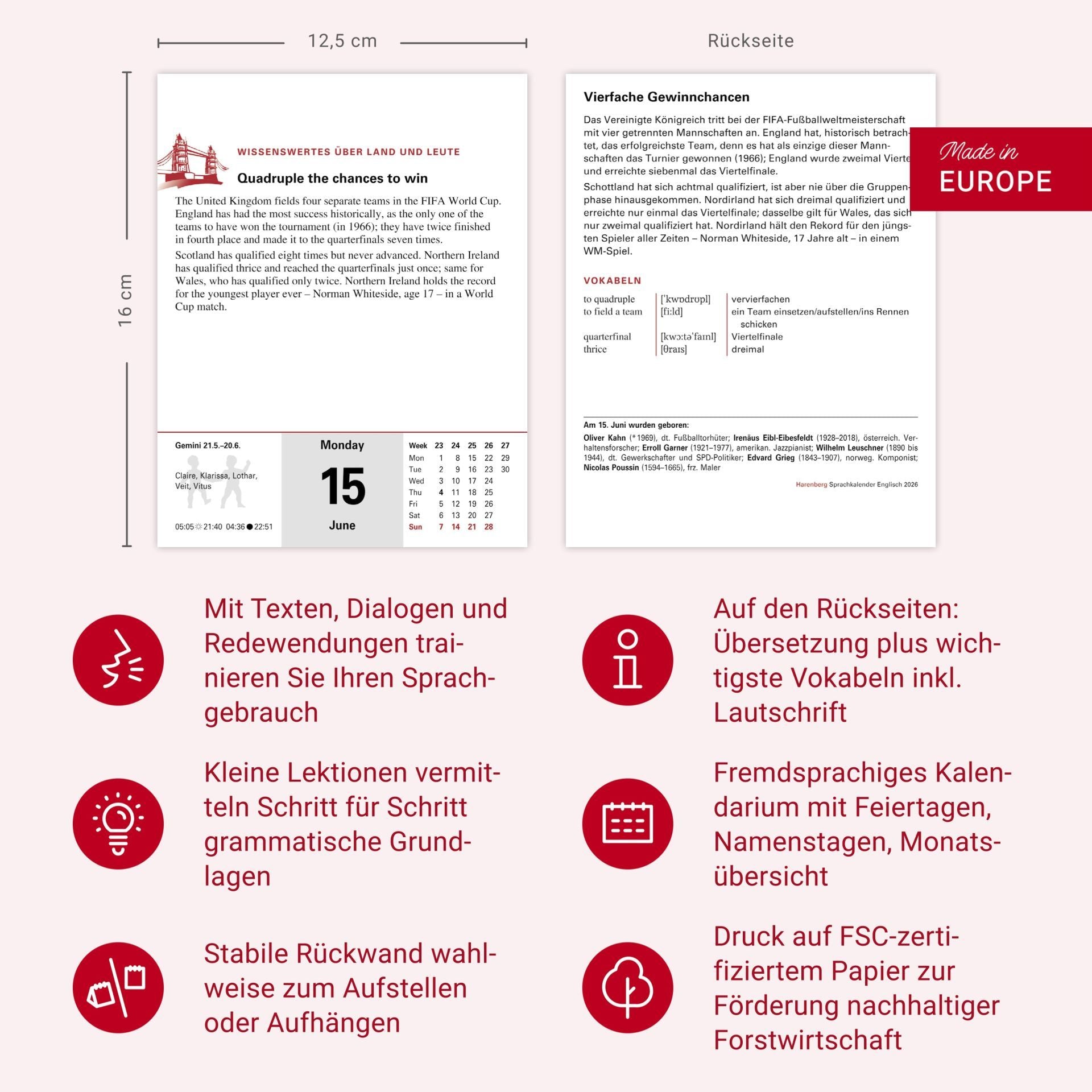 Englisch lernen, Sprachkalender, Tageskalender 2026, Abreißkalender, Tischkalender, Kalender zum Aufstellen, Aufstellkalender 2026, tägliches Lernen, Fremdsprachen, Wissenskalender, Englischtraining |