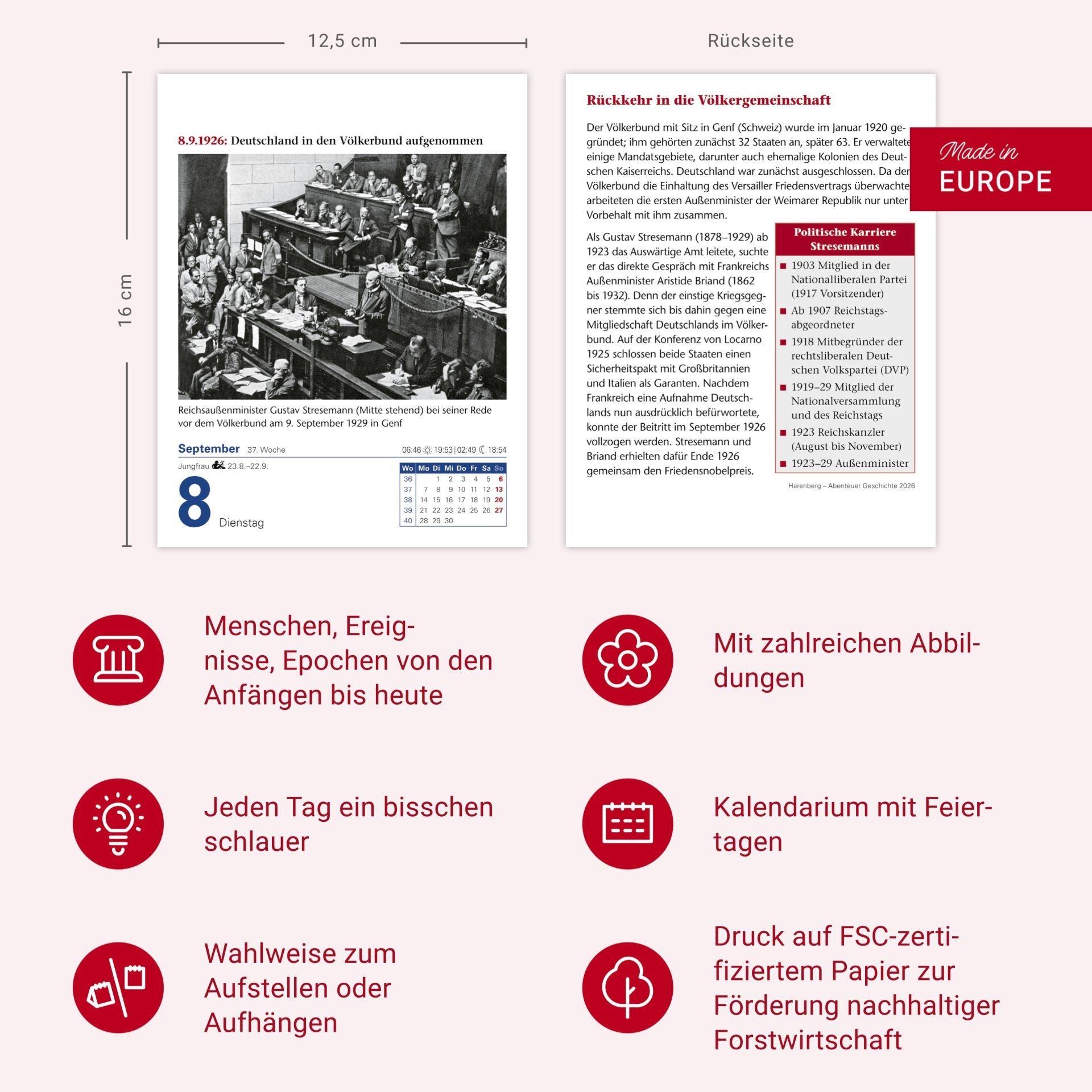 Wissenskalender mit den wichtigsten Ereignissen der Weltgeschichte. Tischkalender für jeden Tag. Tageskalender 2026 zum Abreißen, Maße (B/H): 12,5 × 16 cm, Tischkalender Harenberg – Wissenskalender Harenberg |
