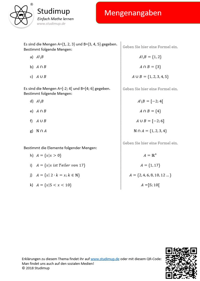 Dieses kostenlose Mathe-Arbeitsblatt zum Thema Mengen bietet eine ideale Übungsmöglichkeit für Schüler:innen der Unter- und Mittelstufe. Es enthält Aufgaben zum Verständnis von Mengen, Teilmengen, Vereinigungen und Schnittmengen.