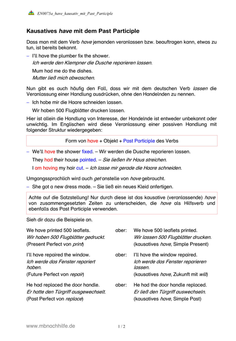 Mit diesem Arbeitsblatt lernen Schüler*innen der Klasse 9 oder 10, wie man das kausative have korrekt verwendet – also Konstruktionen wie have something repaired, get your hair cut oder have the car cleaned. Es wird erklärt, wie sich die Satzstellung vom Present Perfect und anderen Zeitformen unterscheidet und wie man auch ohne Nennung des Handelnden ausdrückt, dass man etwas veranlasst hat.